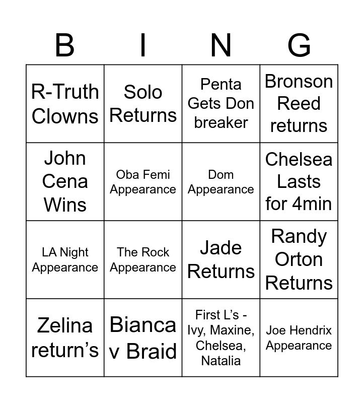 This bingo card has 32 words: Aj Styles Returns, Aj Lee Returns, Randy Orton Returns, Uncle Howdy Appearance, Joe Hendrix Appearance, Dom Appearance, John Cena Wins, CM Punk Wins Punk Gets Roman, Solo Returns, Jordine Grace Appearance, Chelsea Lasts for 4min, Penta Gets Don breaker, Nia v 2, Logan Spot, Bianca v Braid, Naomi Bianca Team Up, Naomi Bianca Disqualify each other, Jade Returns, Bianca Wins, Charlotte Wins, Iyo Wins, First L’s - Chad, Rey, New Day, Otis, Austin, Waller, Dom, First L’s - Ivy, Maxine, Chelsea, Natalia, Jacob Elims > 3, Zelina return’s, Bronson Reed returns, LA Night Appearance, Oba Femi Appearance, R-Truth Clowns, Sheamus Appearance, Cardona returns and The Rock Appearance.