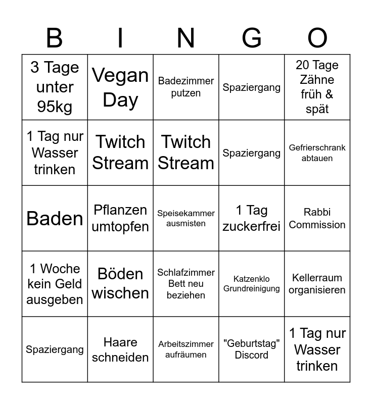 This bingo card has 25 words: Böden wischen, Arbeitszimmer aufräumen, Twitch Stream, Spaziergang, 20 Tage Zähne früh & spät, 3 Tage unter 95kg, 1 Tag nur Wasser trinken, Vegan Day, 1 Tag zuckerfrei, Schlafzimmer Bett neu beziehen, Spaziergang, Baden, Katzenklo Grundreinigung, Kellerraum organisieren, Twitch Stream, 1 Tag nur Wasser trinken, Rabbi Commission, Badezimmer putzen, Gefrierschrank abtauen, Pflanzen umtopfen, Speisekammer ausmisten, Haare schneiden, 1 Woche kein Geld ausgeben, Spaziergang and "Geburtstag" Discord.