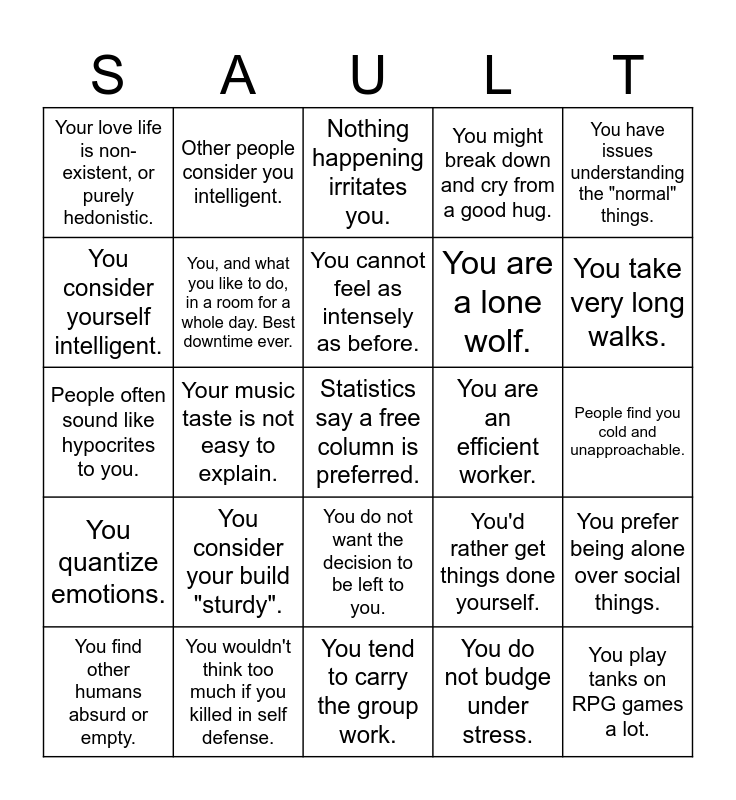 This bingo card has a free space and 24 words: You consider your build "sturdy"., You wouldn't think too much if you killed in self defense., You cannot feel as intensely as before., You find other humans absurd or empty., You have issues understanding the "normal" things., Your love life is non-existent, or purely hedonistic., You consider yourself intelligent., Other people consider you intelligent., You are an efficient worker., You do not want the decision to be left to you., You are a lone wolf., People often sound like hypocrites to you., You'd rather get things done yourself., You prefer being alone over social things., You, and what you like to do, in a room for a whole day. Best downtime ever., You do not budge under stress., People find you cold and unapproachable., Nothing happening irritates you., You take very long walks., Your music taste is not easy to explain., You play tanks on RPG games a lot., You quantize emotions., You might break down and cry from a good hug. and You tend to carry the group work..