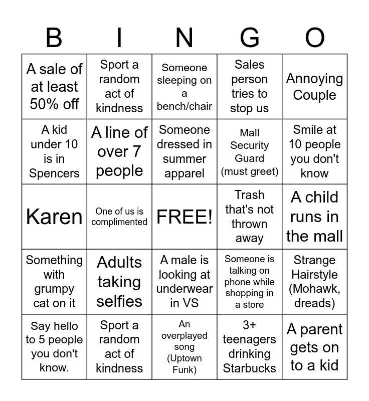 This bingo card has a free space and 24 words: Adults taking selfies, Sport a random act of kindness, Someone dressed in summer apparel, Say hello to 5 people you don't know., Annoying Couple, A sale of at least 50% off, A kid under 10 is in Spencers, Sport a random act of kindness, Trash that's not thrown away, A male is looking at underwear in VS, Mall Security Guard (must greet), Karen, Someone is talking on phone while shopping in a store, Strange Hairstyle (Mohawk, dreads), A line of over 7 people, 3+ teenagers drinking Starbucks, A child runs in the mall, Someone sleeping on a bench/chair, Smile at 10 people you don't know, One of us is complimented, A parent gets on to a kid, Something with grumpy cat on it, Sales person tries to stop us and An overplayed song (Uptown Funk).
