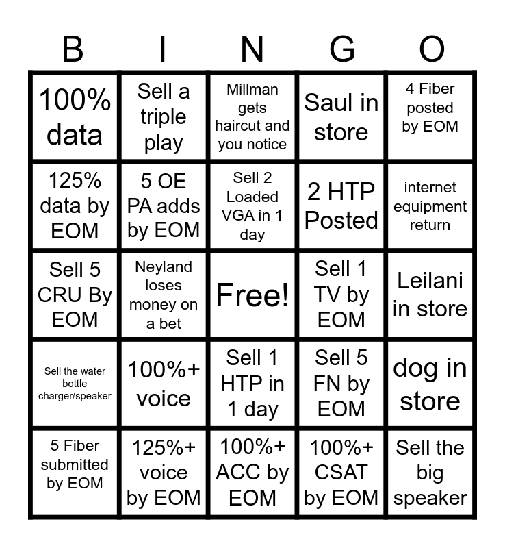 This bingo card has a free space and 24 words: 100%+ voice, 125%+ voice by EOM, Sell 2 Loaded VGA in 1 day, 5 Fiber submitted by EOM, 4 Fiber posted by EOM, 100% data, 125% data by EOM, Sell a triple play, Sell 1 TV by EOM, Sell 1 HTP in 1 day, 2 HTP Posted, Sell 5 CRU By EOM, Sell 5 FN by EOM, dog in store, 5 OE PA adds by EOM, 100%+ CSAT by EOM, Leilani in store, Millman gets haircut and you notice, internet equipment return, Neyland loses money on a bet, Sell the big speaker, Sell the water bottle charger/speaker, Saul in store and 100%+ ACC by EOM.