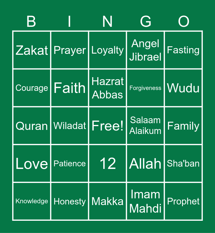 This bingo card has a free space and 32 words: Imam Mahdi, Masjid, Wiladat, Imam Husayn, Love, Faith, Fasting, Sha'ban, Prayer, Kindness, Hazrat Abbas, Loyalty, Ahlul Bayt, Imam Zain-ul-Abideen, Salaam Alaikum, Water, Knowledge, Quran, 12, Patience, Allah, Sunah, Family, Honesty, Prophet, Angel Jibrael, Forgiveness, Courage, Zakat, Makka, Medina and Wudu.