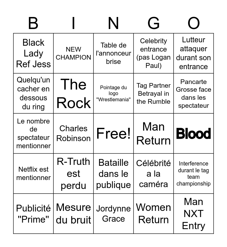 This bingo card has a free space and 31 words: Jordynne Grace, Joe Hendry, Charles Robinson, Lady Ref Jess, Black Lady Ref Jess, Table de l'annonceur brise, The Rock, Célébrité a la caméra, Man Return, Women Return, Blood, Man NXT Entry, Women NXT Entry, Royal Rumble Sauvetage, Pancarte Grosse face dans les spectateur, Wardrobe malfunction, Interference durant le tag team championship, R-Truth est perdu, Netflix est mentionner, Bataille dans le publique, Lutteur attaquer durant son entrance, Lutteuse attaquer durant son entrance, Publicité ''Prime'', NEW CHAMPION, Tag Partner Betrayal in the Rumble, Quelqu'un cacher en dessous du ring, Celebrity entrance (pas Logan Paul), Le nombre de spectateur mentionner, Mesure du bruit, Pointage du logo ''Wrestlemania'' and Pyrotechnie.