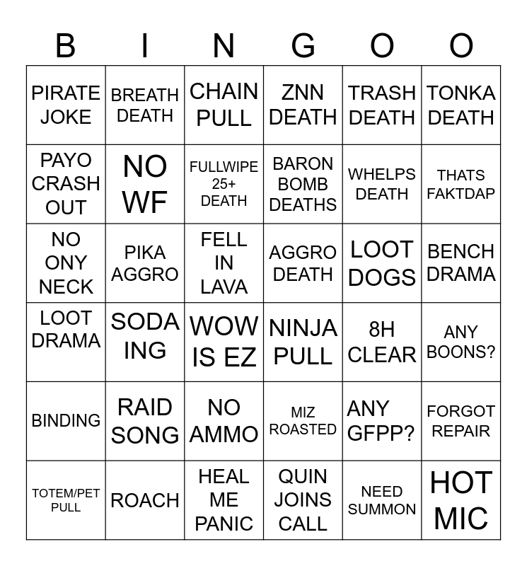 This bingo card has 36 words: LOOT DRAMA, SODA ING, HEAL ME PANIC, BARON BOMB DEATHS, LOOT DOGS, BENCH DRAMA, PIRATE JOKE, ROACH, CHAIN PULL, MIZ ROASTED, WHELPS DEATH, TONKA DEATH, BINDING, PIKA AGGRO, FULLWIPE 25+ DEATH, ZNN DEATH, ANY GFPP?, ANY BOONS?, PAYO CRASH OUT, NO WF, WOW IS EZ, NINJA PULL, 8H CLEAR, FORGOT REPAIR, NO ONY NECK, BREATH DEATH, FELL IN LAVA, QUIN JOINS CALL, TRASH DEATH, THATS FAKTDAP, TOTEM/PET PULL, RAID SONG, NO AMMO, AGGRO DEATH, NEED SUMMON and HOT MIC.