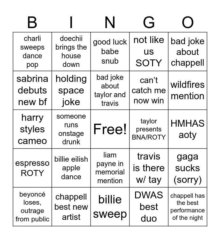 This bingo card has a free space and 24 words: billie eilish apple dance, chappell best new artist, bad joke about taylor and travis, beyoncé loses, outrage from public, bad joke about chappell, charli sweeps dance pop, sabrina debuts new bf, doechii brings the house down, taylor presents BNA/ROTY, liam payne in memorial mention, can’t catch me now win, harry styles cameo, travis is there w/ tay, gaga sucks (sorry), holding space joke, DWAS best duo, HMHAS aoty, good luck babe snub, wildfires mention, someone runs onstage drunk, chappell has the best performance of the night, espresso ROTY, not like us SOTY and billie sweep.