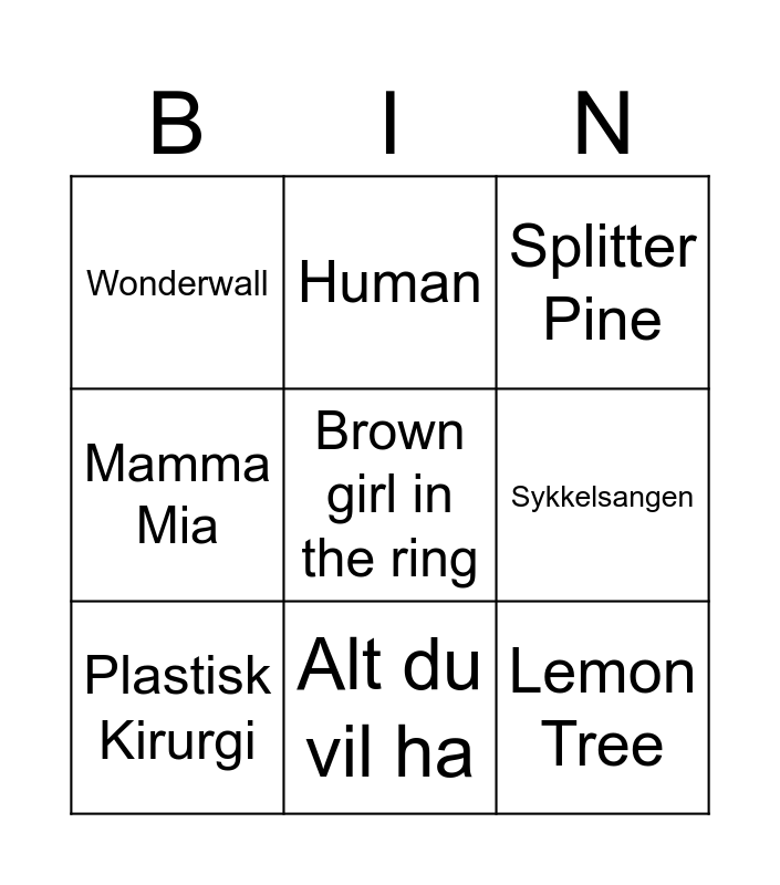 This bingo card has 28 words: Tore Tang, To fulle menn, Lemon Tree, Hit Me Baby One More Time, Sykkelsangen, Splitter Pine, Human, Jenter, Alt for Norge, Granada, Sweet Caroline, Mamma Mia, Forelska i Lærern, Country Roads, Optimist, Idyll, En solskinnsdag, Plastisk Kirurgi, Alt du vil ha, Me to går alltid aleine, Wonderwall, Have you ever seen the rain, Bursdagssang, Sjørøverne Kommer, Stump og Vatn, Tusen Bitar, Brown girl in the ring and Cotton Fields.