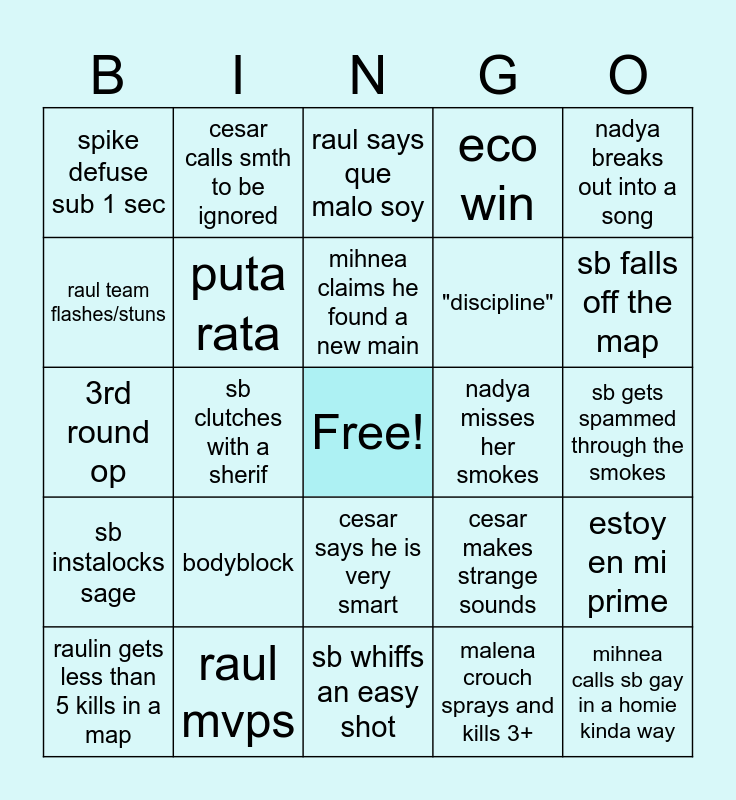 This bingo card has a free space and 39 words: sb types 2 lines+ passive-agressive message in chat, joder macho, ostia puta, puta rata, raulin gets less than 5 kills in a map, cesar says he is very smart, mihnea claims he found a new main, sb aces, nadya breaks out into a song, sb instalocks sage, sb clutches with a sherif, eco win, mihnea calls sb gay in a homie kinda way, sb gets spammed through the smokes, nadya misses her smokes, bodyblock, game goes overtime, spike defuse sub 1 sec, malena goes off on a tangent, cesar makes strange sounds, raul team flashes/stuns, sb whiffs an easy shot, "discipline", sb falls off the map, leon goes non-verbal, javivi internet xxx, breach ulti A VOLAR, malena one tap, sb says they are good and insta die, cesar calls smth to be ignored, mihnea says he has to do HW, 13-0 // 0-13, raul says que malo soy, raul mvps, malena crouch sprays and kills 3+, troleada historica, estoy en mi prime, 3rd round op and RELOAD AFTER 2 BULLETS.