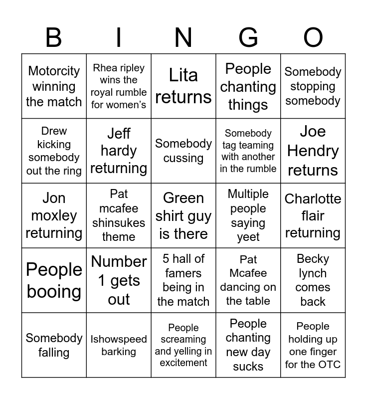 This bingo card has a free space and 24 words: Number 1 gets out, Ishowspeed barking, Somebody cussing, Somebody falling, Somebody stopping somebody, Motorcity winning the match, Drew kicking somebody out the ring, Rhea ripley wins the royal rumble for women’s, Multiple people saying yeet, 5 hall of famers being in the match, Somebody tag teaming with another in the rumble, Jon moxley returning, Pat Mcafee dancing on the table, Becky lynch comes back, Jeff hardy returning, People chanting new day sucks, Charlotte flair returning, Lita returns, Joe Hendry returns, Pat mcafee shinsukes theme, People holding up one finger for the OTC, People booing, People chanting things and People screaming and yelling in excitement.