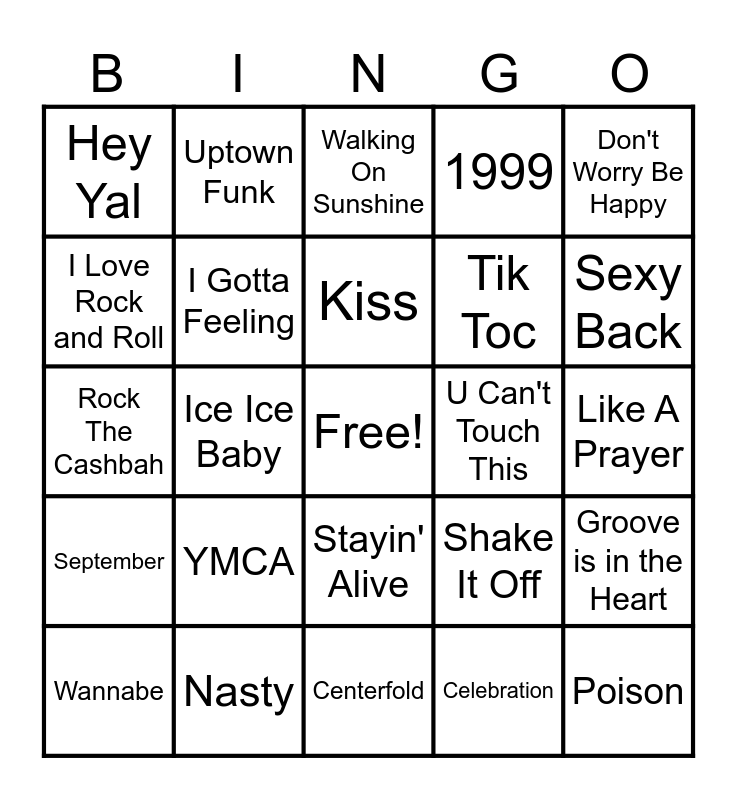 This bingo card has a free space and 34 words: Love Shack, Celebration, Dancing Queen, Happy, September, I Gotta Feeling, Don't Worry Be Happy, Wannabe, Uptown Funk, 24K Magic, Kiss, Walking On Sunshine, Jump, I Will Survive, U Can't Touch This, Sexy Back, Nasty, Rock The Cashbah, YMCA, Shake It Off, Stayin' Alive, Sweet Caroline, Hey Yal, Like A Prayer, Centerfold, Poison, 1999, Party In the USA, Tik Toc, I Love Rock and Roll, Holiday, Ice Ice Baby, Groove is in the Heart and You Shook Me All Night Long.