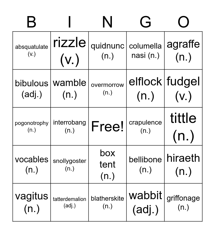 This bingo card has a free space and 39 words: glabella (n.), petrichor (n.), aglet (n.), wamble (n.), vagitus (n.), box tent (n.), overmorrow (n.), minimus (n.), agraffe (n.), vocables (n.), interrobang (n.), columella nasi (n.), griffonage (n.), tittle (n.), crapulence (n.), snollygoster (n.), gubbins (n.), absquatulate (v.), apricate (v.), bellibone (n.), bibulous (adj.), blatherskite (n.), elflock (n.), fudgel (v.), groak (v.), pelf (n.), nebbish (n.), quire (n.), bibble (v.), rizzle (v.), stravage (v.), Weltschmerz (n.), quidnunc (n.), tatterdemalion (adj.), wabbit (adj.), ultracrepidarian (n.), hiraeth (n.), pogonotrophy (n.) and slonk (v.).