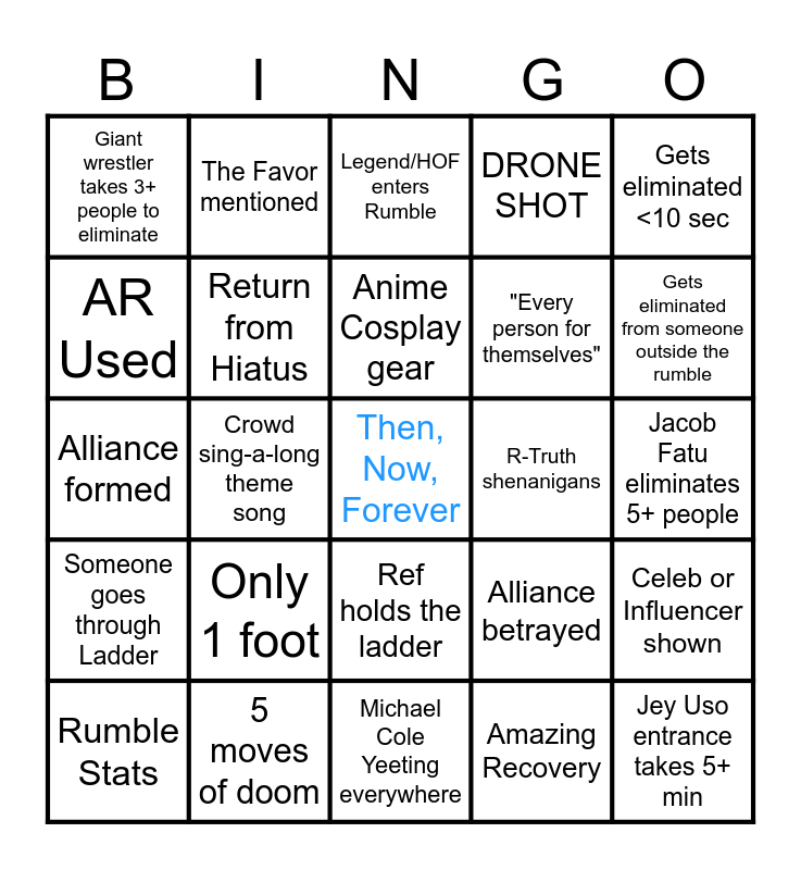 This bingo card has a free space and 29 words: Rumble Stats, TNA cross the line, Crowd sing-a-long theme song, The Sign Point, Giant wrestler takes 3+ people to eliminate, Legend/HOF enters Rumble, Return from Hiatus, Only 1 foot, R-Truth shenanigans, 5 moves of doom, Jacob Fatu eliminates 5+ people, Jey Uso entrance takes 5+ min, Michael Cole Yeeting everywhere, Amazing Recovery, Gets eliminated from someone outside the rumble, Kevin Owens aerial move gets countered, Ref holds the ladder, Someone goes through Ladder, Gets eliminated <10 sec, Alliance formed, Alliance betrayed, Twerking, "Every person for themselves", AR Used, DRONE SHOT, The Favor mentioned, Celeb or Influencer shown, Anime Cosplay gear and Countdown mistimed.
