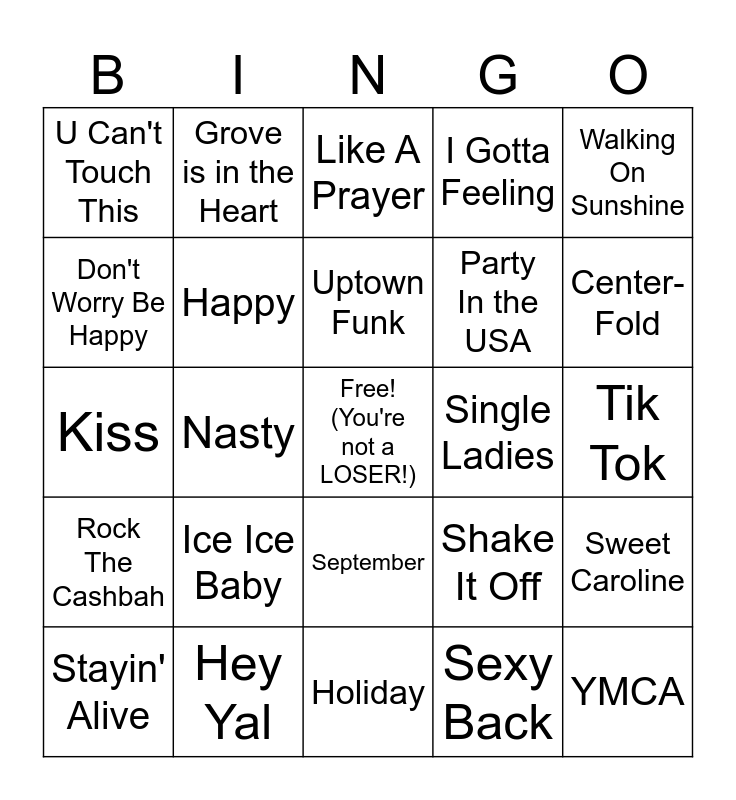 This bingo card has a free space and 35 words: Love Shack, Celebration, Dancing Queen, Happy, September, I Gotta Feeling, Don't Worry Be Happy, Wannabe, Uptown Funk, 24k Magic, Kiss, Walking On Sunshine, Jump, I Will Survive, U Can't Touch This, Single Ladies, Sexy Back, Nasty, Rock The Cashbah, YMCA, Shake It Off, Stayin' Alive, Sweet Caroline, Hey Yal, Like A Prayer, Center-Fold, Poison, 1999, Party In the USA, Tik Tok, I Love Rock and Roll, Holiday, Ice Ice Baby, Grove is in the Heart and You Shook Me All Night Long.