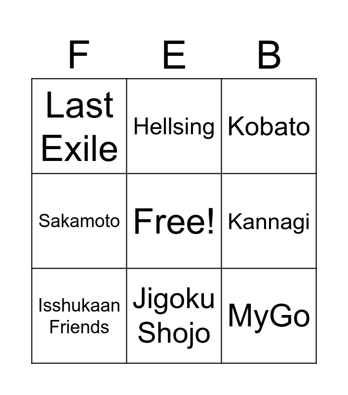 This bingo card has a free space and 8 words: Kannagi, Kobato, Hellsing, Isshukaan Friends, Last Exile, MyGo, Sakamoto and Jigoku Shojo.