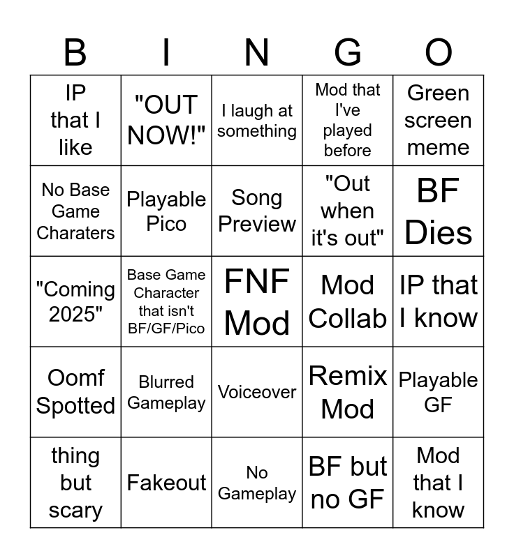 This bingo card has a free space and 24 words: Blurred Gameplay, Fakeout, Song Preview, thing but scary, Green screen meme, IP that I like, No Base Game Charaters, "OUT NOW!", Mod Collab, Voiceover, "Out when it's out", "Coming 2025", Remix Mod, Playable GF, Playable Pico, BF but no GF, IP that I know, I laugh at something, BF Dies, Base Game Character that isn't BF/GF/Pico, Mod that I know, Oomf Spotted, Mod that I've played before and No Gameplay.