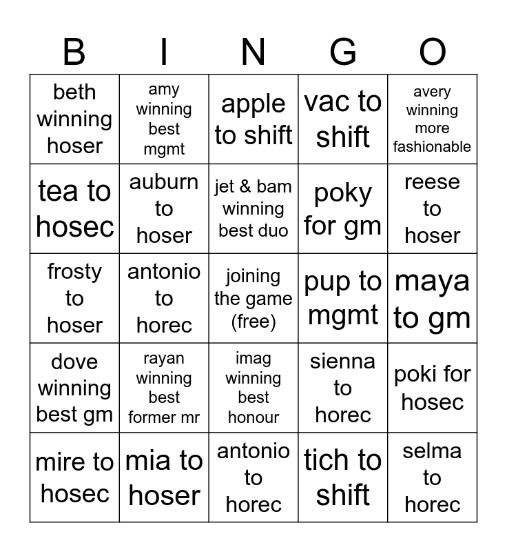 This bingo card has a free space and 24 words: rayan winning best former mr, mia to hoser, jet & bam winning best duo, mire to hosec, avery winning more fashionable, beth winning hoser, tea to hosec, amy winning best mgmt, pup to mgmt, imag winning best honour, poky for gm, frosty to hoser, sienna to horec, poki for hosec, auburn to hoser, tich to shift, maya to gm, apple to shift, reese to hoser, antonio to horec, selma to horec, dove winning best gm, vac to shift and antonio to horec.