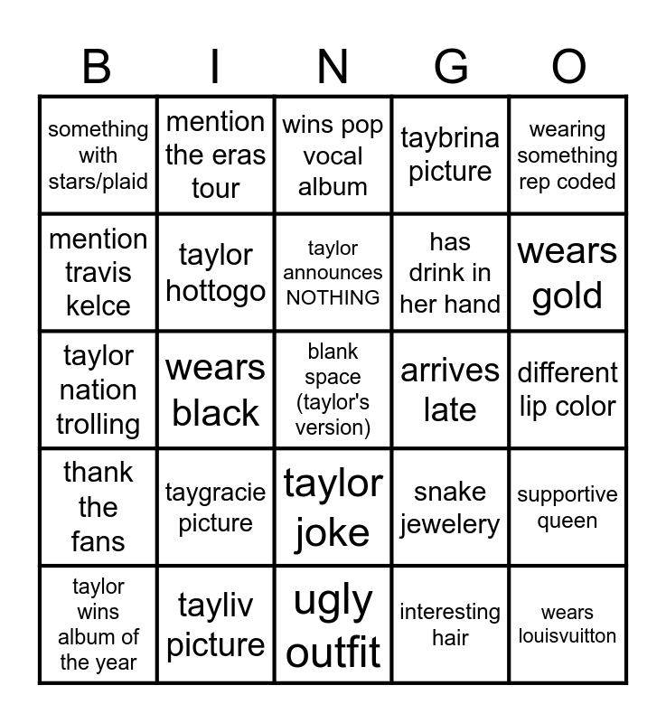 This bingo card has a free space and 24 words: taygracie picture, tayliv picture, taylor announces NOTHING, taylor wins album of the year, wearing something rep coded, something with stars/plaid, mention travis kelce, mention the eras tour, arrives late, taylor joke, has drink in her hand, taylor nation trolling, snake jewelery, supportive queen, taylor hottogo, interesting hair, different lip color, wins pop vocal album, wears gold, wears black, wears louisvuitton, thank the fans, taybrina picture and ugly outfit.