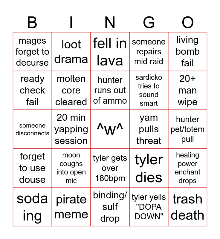 This bingo card has a free space and 24 words: moon coughs into open mic, pirate meme, hunter runs out of ammo, soda ing, living bomb fail, mages forget to decurse, ready check fail, loot drama, yam pulls threat, tyler gets over 180bpm, sardicko tries to sound smart, someone disconnects, tyler dies, healing power enchant drops, molten core cleared, tyler yells "DOPA DOWN", hunter pet/totem pull, fell in lava, 20+ man wipe, 20 min yapping session, trash death, forget to use douse, someone repairs mid raid and binding/ sulf drop.