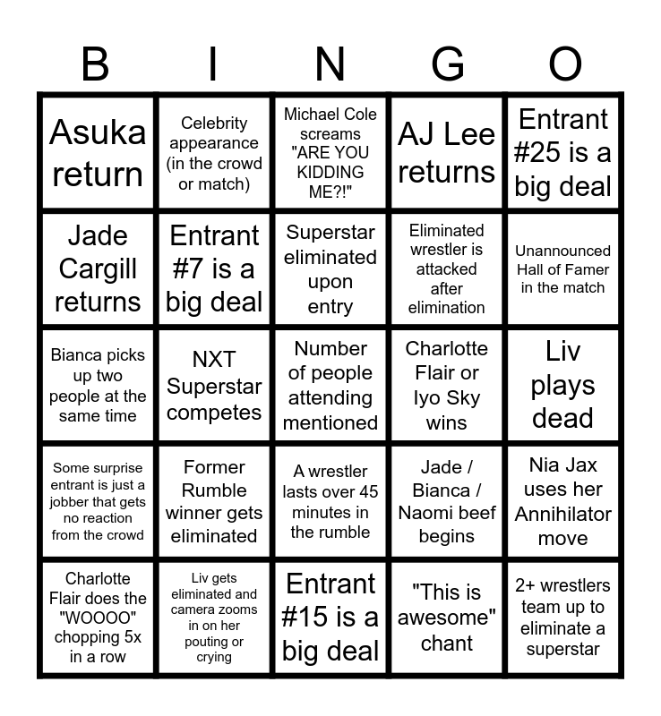 This bingo card has 50 words: Nikki Bella mention, Number of people attending mentioned, Interference by someone not in the match, Entrant #15 is a big deal, Former Rumble winner gets eliminated, Self-elimination, Celebrity appearance (in the crowd or match), Jordynne Grace in the match, Jade Cargill returns, Commentary team declares their pick to win, Entrant #7 is a big deal, AJ Lee returns, Nia Jax uses her Annihilator move, Jade / Bianca / Naomi beef begins, One foot touches the ground, Comedy / gimmick segment, Superstar eliminated upon entry, Charlotte Flair or Iyo Sky wins, Superstar speaks on the mic before they enter the ring, Entrant #25 is a big deal, NXT Superstar competes, "This is awesome" chant, Asuka return, Eliminated wrestler is attacked after elimination, Eliminated wrestler attacks a wrestler after elimination, 2+ wrestlers team up to eliminate a superstar, Unannounced Hall of Famer in the match, Unannounced WWE legend returns, Michael Cole screams "ARE YOU KIDDING ME?!", A wrestler lasts over 45 minutes in the rumble, Someone tries to hide under the ring, Commentary team heavily pushes the "Wrestlemania main event opportunity" angle, Someone on commentary mispronounces a wrestler's name, Bayley / Naomi betrayal, Liv gets eliminated and camera zooms in on her pouting or crying, Raquel picks up two people at the same time, Lyra lands on the apron to save herself from elimination, Ivy Niles no-sells a big move, Bayley taunts or yells at someone after eliminating them, Liv plays dead, Raquel has a hard time eliminating a "small" wrestler, Lyra does a top-rope dive, Commentary says something about Ivy Niles' MMA background, Nia Jax is eliminated without getting ganged up on, Charlotte Flair does the "WOOOO" chopping 5x in a row, Bianca picks up two people at the same time, Iyo Sky screams before the dropkick, Final two in the rumble have a dramatic stare down before fighting, Some surprise entrant is just a jobber that gets no reaction from the crowd and Referee fails to see match interference.
