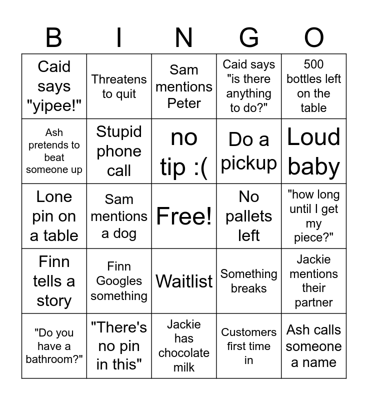 This bingo card has a free space and 24 words: Finn Googles something, "There's no pin in this", no tip :(, "Do you have a bathroom?", 500 bottles left on the table, Caid says "yipee!", Ash pretends to beat someone up, Threatens to quit, No pallets left, Waitlist, Do a pickup, Lone pin on a table, Something breaks, Jackie mentions their partner, Stupid phone call, Customers first time in, "how long until I get my piece?", Sam mentions Peter, Loud baby, Sam mentions a dog, Ash calls someone a name, Finn tells a story, Caid says "is there anything to do?" and Jackie has chocolate milk.