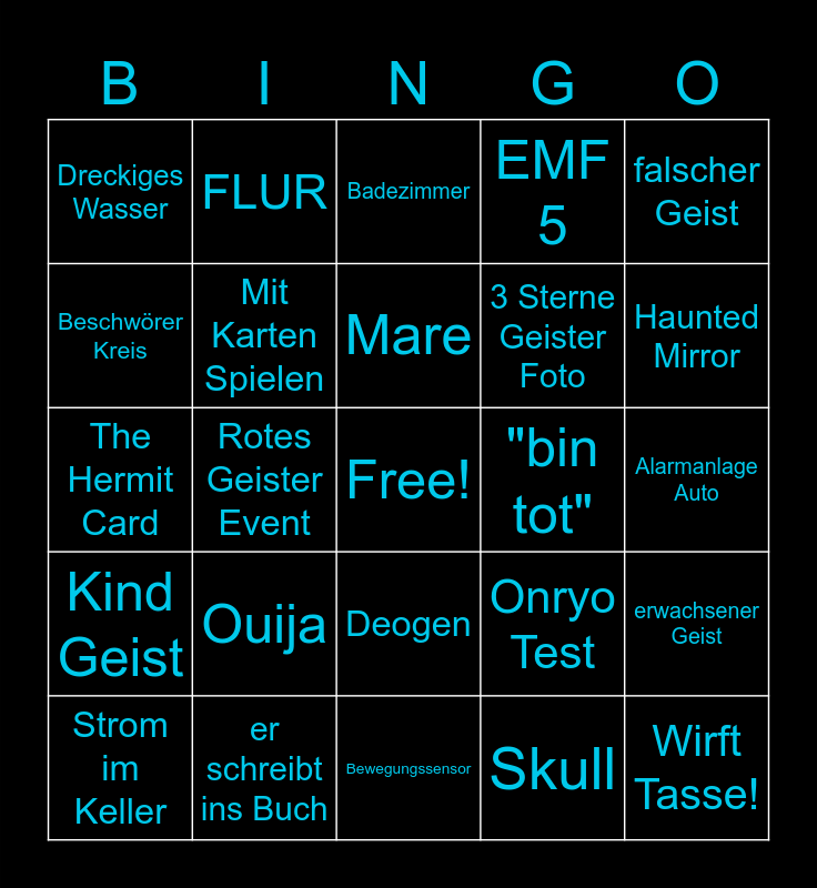 This bingo card has a free space and 24 words: Ouija, er schreibt ins Buch, Mare, Strom im Keller, falscher Geist, Dreckiges Wasser, Beschwörer Kreis, FLUR, "bin tot", Deogen, 3 Sterne Geister Foto, The Hermit Card, Onryo Test, erwachsener Geist, Mit Karten Spielen, Skull, Alarmanlage Auto, Badezimmer, Haunted Mirror, Rotes Geister Event, Wirft Tasse!, Kind Geist, EMF 5 and Bewegungssensor.