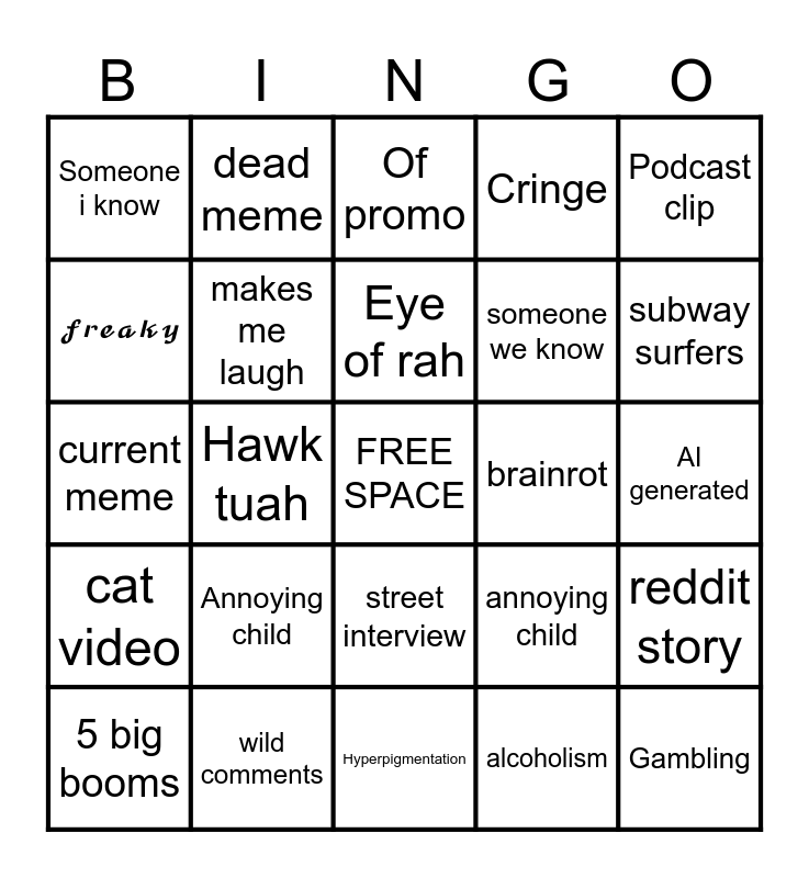 This bingo card has a free space and 24 words: 5 big booms, Annoying child, Eye of rah, alcoholism, Podcast clip, Someone i know, dead meme, Of promo, brainrot, AI generated, current meme, makes me laugh, annoying child, reddit story, 𝓯𝓻𝓮𝓪𝓴𝔂, wild comments, Hyperpigmentation, Cringe, subway surfers, cat video, Hawk tuah, street interview, someone we know and Gambling.