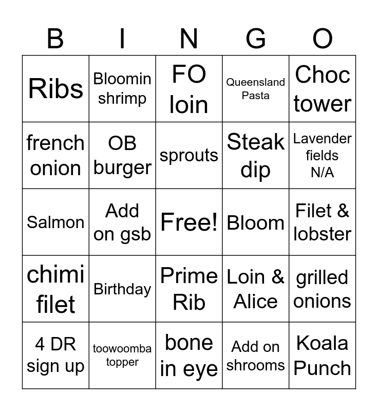 This bingo card has a free space and 24 words: Birthday, toowoomba topper, sprouts, 4 DR sign up, Choc tower, Ribs, french onion, Bloomin shrimp, Bloom, Prime Rib, Steak dip, Salmon, Loin & Alice, grilled onions, OB burger, Add on shrooms, Filet & lobster, FO loin, Lavender fields N/A, Add on gsb, Koala Punch, chimi filet, Queensland Pasta and bone in eye.