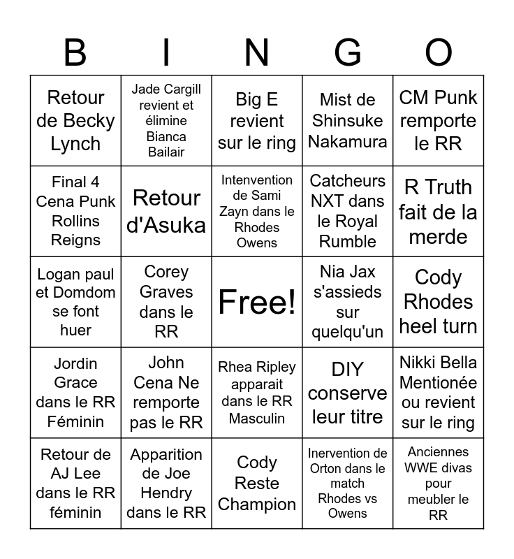 This bingo card has a free space and 24 words: John Cena Ne remporte pas le RR, Apparition de Joe Hendry dans le RR, Intenvention de Sami Zayn dans le Rhodes Owens, Retour de AJ Lee dans le RR féminin, CM Punk remporte le RR, Retour de Becky Lynch, Final 4 Cena Punk Rollins Reigns, Jade Cargill revient et élimine Bianca Bailair, Nia Jax s'assieds sur quelqu'un, Rhea Ripley apparait dans le RR Masculin, Catcheurs NXT dans le Royal Rumble, Logan paul et Domdom se font huer, DIY conserve leur titre, Nikki Bella Mentionée ou revient sur le ring, Retour d'Asuka, Inervention de Orton dans le match Rhodes vs Owens, Cody Rhodes heel turn, Big E revient sur le ring, R Truth fait de la merde, Corey Graves dans le RR, Anciennes WWE divas pour meubler le RR, Jordin Grace dans le RR Féminin, Mist de Shinsuke Nakamura and Cody Reste Champion.