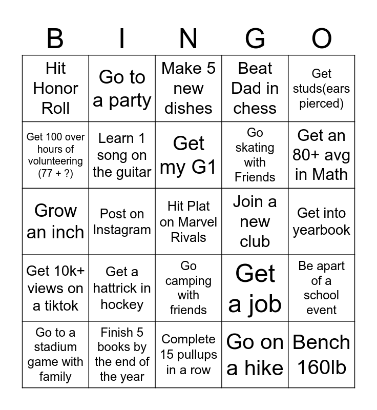 This bingo card has a free space and 24 words: Get a hattrick in hockey, Finish 5 books by the end of the year, Get my G1, Go to a stadium game with family, Get studs(ears pierced), Hit Honor Roll, Get 100 over hours of volunteering (77 + ?), Go to a party, Join a new club, Go camping with friends, Go skating with Friends, Grow an inch, Get a job, Be apart of a school event, Learn 1 song on the guitar, Go on a hike, Get into yearbook, Make 5 new dishes, Get an 80+ avg in Math, Post on Instagram, Bench 160lb, Get 10k+ views on a tiktok, Beat Dad in chess and Complete 15 pullups in a row.
