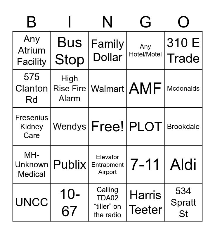 This bingo card has a free space and 42 words: Walgreens, Walmart, Food Lion, Publix, Harris Teeter, Aldi, 534 Spratt St, 1000 Baxter St, Family Dollar, Elevator Entrapment Airport, Brookdale, Mcdonalds, Wendys, 310 E Trade, 429 or 501 Billingsly, 7-11, QT, Fresenius Kidney Care, Circle K, Bus Stop, 575 Clanton Rd, Car Wash, CFD Station, Any Atrium Facility, Any Novant Facility, Shell, AMF, Dunkin Donuts, MH-Assault, MVA on Freeway, MH-Fall with Injury, MH-Unknown Medical, High Rise Fire Alarm, Calling TDA02 “tiller” on the radio, Parking Deck, UNCC, 10-67, PLOT, Any CMS school, Lang Line, Any Hotel/Motel and Ask ETA for Medic.