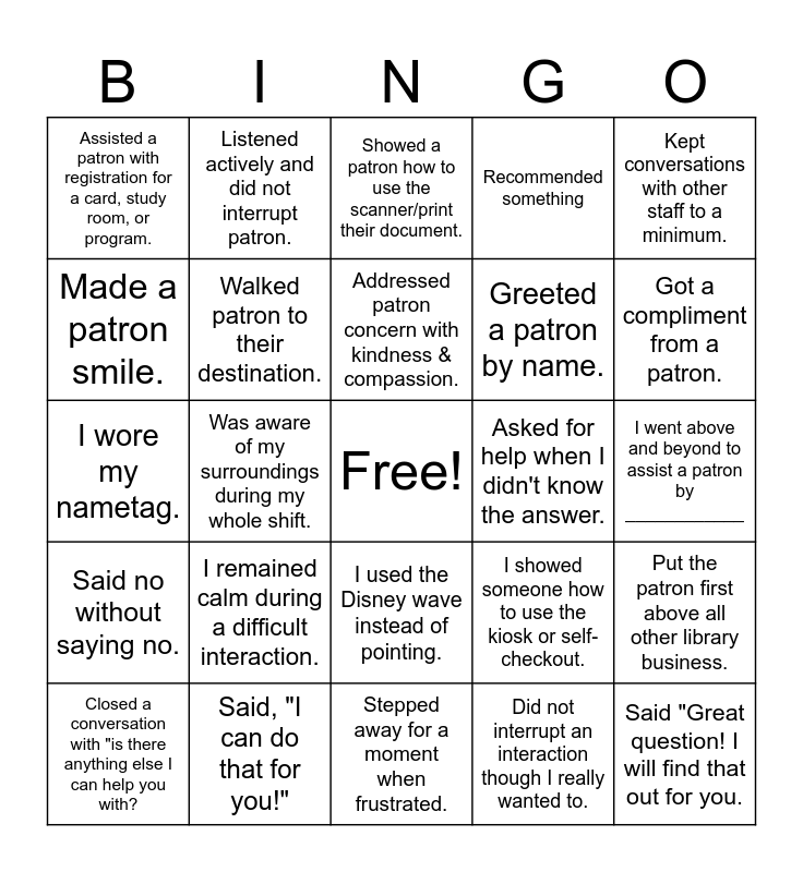 This bingo card has a free space and 32 words: Did not interrupt an interaction though I really wanted to., I was approachable to patrons., Was aware of my surroundings during my whole shift., Greeted patron with a smile and acknowledged their presence., Said no without saying no., Walked patron to their destination., Kept conversations with other staff to a minimum., Put the patron first above all other library business., Listened actively and did not interrupt patron., Locked my computer when I walked away to help a patron., Addressed patron concern with kindness & compassion., Showed a patron how to use the scanner/print their document., Kept impromptu conversations to a minimum., Did not use my cell phone at the desk., Asked for help when I didn't know the answer., Asked questions to clarify patrons needs., Closed a conversation with "is there anything else I can help you with?, I wore my nametag., I used the Disney wave instead of pointing., I remained calm during a difficult interaction., I showed someone how to use the kiosk or self-checkout., Assisted someone with a technology issue on a personal device, pleasantly., I went above and beyond to assist a patron by ____________, Said, "I can do that for you!", Said "Great question! I will find that out for you., Recommended something, Greeted a patron by name., Made a patron smile., Assisted a patron with registration for a card, study room, or program., Stepped away for a moment when frustrated., Showed empathy. and Got a compliment from a patron..