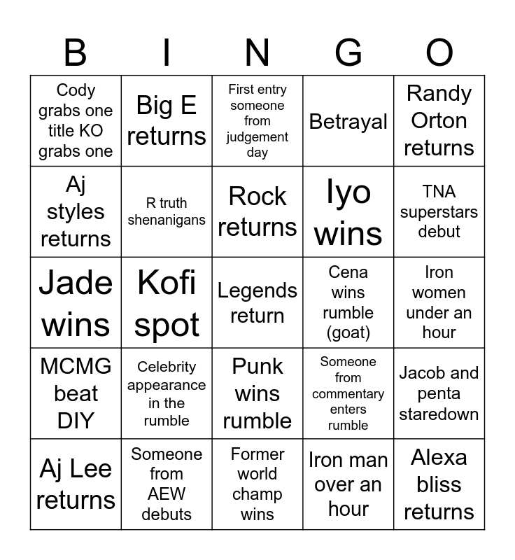 This bingo card has a free space and 24 words: Celebrity appearance in the rumble, Someone from AEW debuts, Rock returns, Aj Lee returns, Randy Orton returns, Cody grabs one title KO grabs one, Aj styles returns, Big E returns, Cena wins rumble (goat), Punk wins rumble, Iyo wins, Jade wins, Someone from commentary enters rumble, Jacob and penta staredown, R truth shenanigans, Iron man over an hour, Iron women under an hour, First entry someone from judgement day, TNA superstars debut, Kofi spot, Alexa bliss returns, MCMG beat DIY, Betrayal and Former world champ wins.