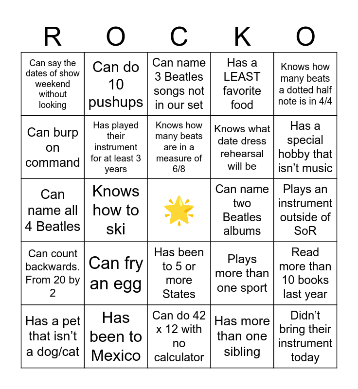 This bingo card has a free space and 29 words: Has a pet that isn’t a dog/cat, Woke up before 7AM today, Knows how to ski, Has never been in the annex before, Can say the dates of show weekend without looking, Can name 3 Beatles songs not in our set, Has played their instrument for at least 3 years, Can fry an egg, Can name two Beatles albums, Has been to Mexico, Plays an instrument outside of SoR, Didn’t bring their instrument today, Can do 42 x 12 with no calculator, Has more than one sibling, Has a special hobby that isn’t music, Has practiced a martial art, Has been to 5 or more States, Can count backwards. From 20 by 2, Knows how many beats a dotted half note is in 4/4, Can name all 4 Beatles, Plays more than one sport, Has been to Disneyland, Knows what date dress rehearsal will be, Can burp on command, Has a LEAST favorite food, Can do 10 pushups, Read more than 10 books last year, Knows how many beats are in a measure of 6/8 and Can say how many beats a 16th note takes up.