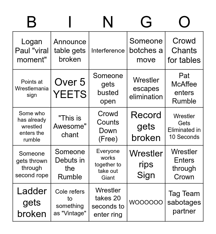 This bingo card has a free space and 31 words: Wrestler takes 20 seconds to enter ring, Prime Table gets messed up, "This is Awesome" chant, 3 celebrities shown in a row, Logan Paul "viral moment", Interference, Over 5 YEETS, Wrestler rips Sign, Record gets broken, WOOOOOO, Wrestler Gets Eliminated in 10 Seconds, Tag Team sabotages partner, Rules are explained over 5 times, Wrestler skins the cat, Pat McAffee enters Rumble, Multiple Ladders used at one time, Wrestler Enters through Crown, Someone Debuts in the Rumble, Someone gets thrown through second rope, Everyone works together to take out Giant, Crowd Chants for tables, 2 wrestlers eliminated at the same time, Ladder gets broken, Announce table gets broken, Wrestler escapes elimination, Points at Wrestlemania sign, Someone botches a move, Some who has already wrestled enters the rumble, Cole refers to something as "Vintage", Someone gets busted open and A non-main roster champion enters Rumble.
