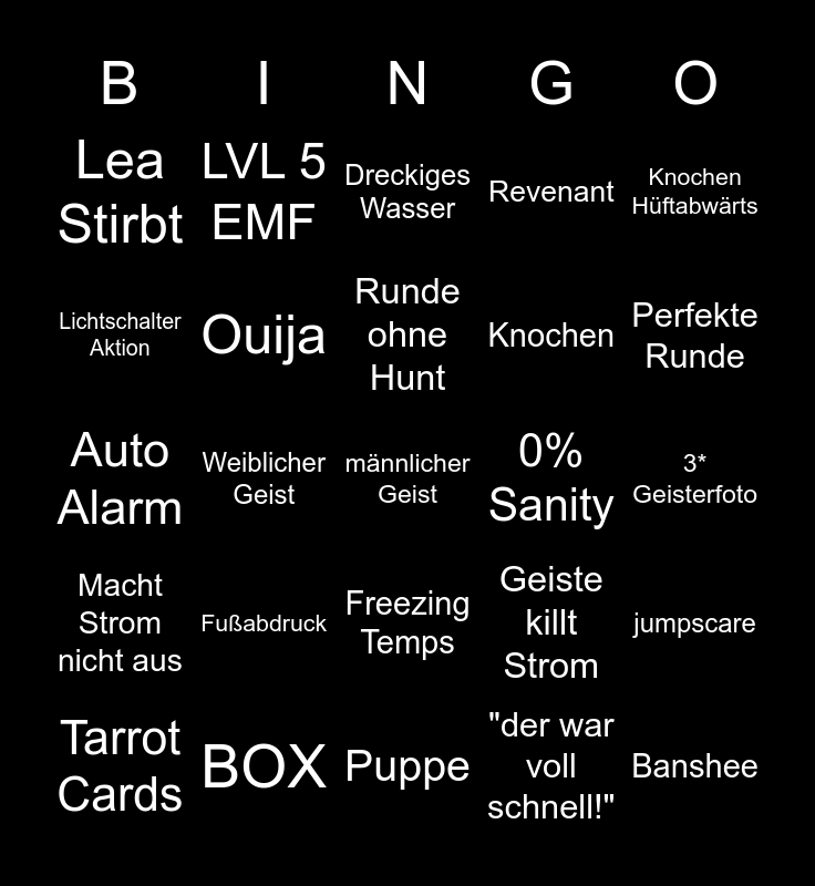 This bingo card has a free space and 24 words: Fußabdruck, BOX, Runde ohne Hunt, Tarrot Cards, Knochen Hüftabwärts, Lea Stirbt, Lichtschalter Aktion, LVL 5 EMF, 0% Sanity, Freezing Temps, Knochen, Auto Alarm, Geiste killt Strom, jumpscare, Ouija, "der war voll schnell!", 3* Geisterfoto, Dreckiges Wasser, Perfekte Runde, Weiblicher Geist, Banshee, Macht Strom nicht aus, Revenant and Puppe.