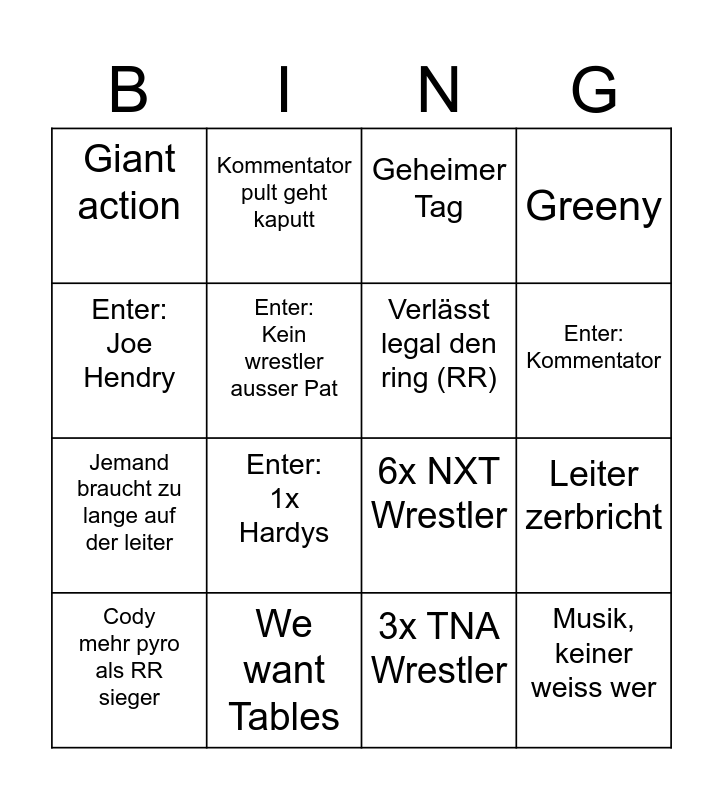 This bingo card has 16 words: We want Tables, Leiter zerbricht, Geheimer Tag, Giant action, Jemand braucht zu lange auf der leiter, Kommentator pult geht kaputt, 6x NXT Wrestler, 3x TNA Wrestler, Enter: Joe Hendry, Enter: Kein wrestler ausser Pat, Cody mehr pyro als RR sieger, Greeny, Enter: 1x Hardys, Enter: Kommentator, Verlässt legal den ring (RR) and Musik, keiner weiss wer.