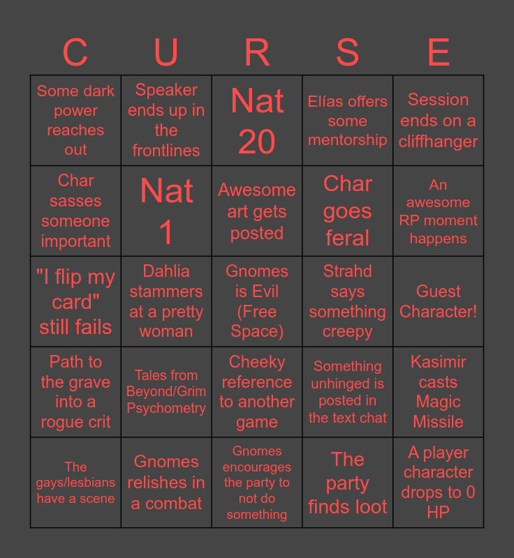 This bingo card has a free space and 29 words: The gays/lesbians have a scene, Speaker says something shifty, Dahlia stammers at a pretty woman, Someone makes a dog joke at Elías, Some dark power reaches out, Nat 20, Nat 1, Tales from Beyond/Grim Psychometry, Strahd says something creepy, Gnomes relishes in a combat, Guest Character!, A player character drops to 0 HP, Gnomes encourages the party to not do something, The party finds loot, An awesome RP moment happens, Something breaks in Owlbear, Cheeky reference to another game, Path to the grave into a rogue crit, Session ends on a cliffhanger, "I flip my card" still fails, Something unhinged is posted in the text chat, Dahlia action surge changes the combat, Char goes feral, Char sasses someone important, Elías offers some mentorship, Speaker ends up in the frontlines, Kasimir casts Magic Missile, Awesome art gets posted and "In pathfinder, that would have crit".