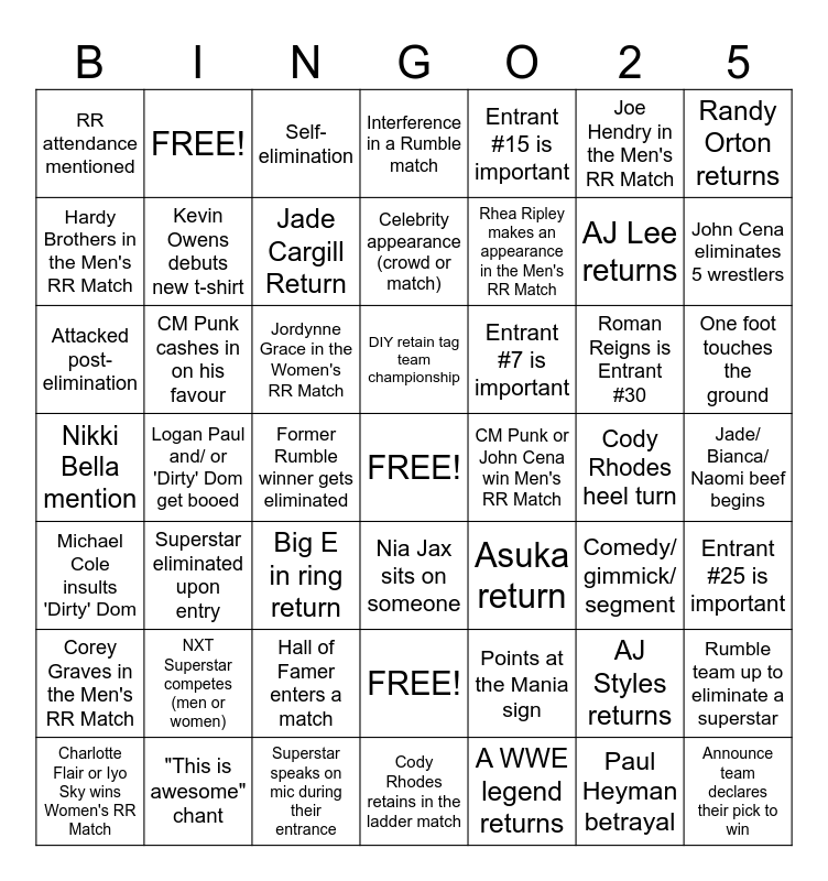 This bingo card has a free space and 48 words: Points at the Mania sign, AJ Lee returns, Cody Rhodes retains in the ladder match, Logan Paul and/ or 'Dirty' Dom get booed, Jordynne Grace in the Women's RR Match, Jade/ Bianca/ Naomi beef begins, FREE!, "This is awesome" chant, Joe Hendry in the Men's RR Match, Nia Jax sits on someone, Randy Orton returns, Interference in a Rumble match, Roman Reigns is Entrant #30, Entrant #7 is important, Corey Graves in the Men's RR Match, Cody Rhodes heel turn, Hardy Brothers in the Men's RR Match, John Cena eliminates 5 wrestlers, AJ Styles returns, Entrant #15 is important, Rhea Ripley makes an appearance in the Men's RR Match, Former Rumble winner gets eliminated, RR attendance mentioned, Kevin Owens debuts new t-shirt, Rumble team up to eliminate a superstar, Jade Cargill Return, One foot touches the ground, Charlotte Flair or Iyo Sky wins Women's RR Match, DIY retain tag team championship, CM Punk cashes in on his favour, Paul Heyman betrayal, CM Punk or John Cena win Men's RR Match, Entrant #25 is important, NXT Superstar competes (men or women), Nikki Bella mention, Asuka return, Comedy/ gimmick/ segment, Attacked post- elimination, Big E in ring return, Hall of Famer enters a match, Michael Cole insults 'Dirty' Dom, Announce team declares their pick to win, Self-elimination, Superstar speaks on mic during their entrance, Celebrity appearance (crowd or match), FREE!, Superstar eliminated upon entry and A WWE legend returns.