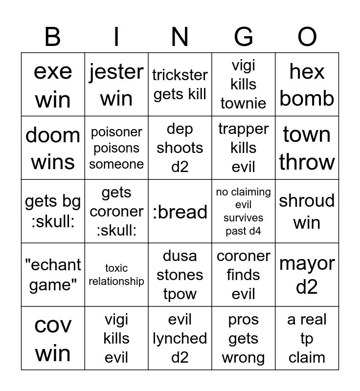 This bingo card has a free space and 99 words: NA wins, EXE claims psy, knights n1, trickster gets kill, dep kills town, pirate wins d3, PEST w, Real d1 claim, VFR/VRA, matching names, character from a game you know, evil tpow claim, rampage kills 3+, dusa stones tpow, jailor exe's townie, exe win, jester win, pirate kills all evil, votes up pirate, gay tos player, death note used for snitching on defense, apoc transforms, famine w, death w, EVIL claims coroner, mayor d2, dep shoots d2, dep shoots evil, "why, me", rit gets revealed, evil lynched d2, pros gets wrong, pros d2, vet bait tpow, gets coroner :skull:, gets bg :skull:, gets admier, gets proposed to, propose declined, toxic relationship, cov throw, town throw, vigi kills townie, vigi kills evil, less than or 4 townies, only 2 coven, perfect cov game, double same role neutrals, shrouded seer double kill, arso 5+ ignighted, vet kills 2+, a real tp claim, coroner finds evil, wildling claims spy/LO, witch witches vigi, necro uses powerful attack role, crus kills townie, crus double kills, bg/cleric selfed correctly, tp doesn't go on tpow, grim skin user, tavern rb'd conf town, psy evil will has 2+ evils, voodoo and dw combo, conj kills other evils, hex bomb, jinx kills someone, 5+ dc, jinx gets revealed, "echant game", trapper kills townie, trapper kills evil, doom wins, full na, pm reveals evil, pois claims tavern, poisoner poisons someone, pros uses both prosecutions, mon knights evil, dies n1, no claiming evil survives past d4, person speaks in 3rd person, successfully protects someone n1, 3 or more people die n1, arso win, war w, ww win, sk win, shroud win, cov win, town win, weird death note, admirer brings up dating app in will, propose accepted, toxic tos2 player, fake silenced, met the creator in game (K1R4 ), "Rebecca " and iron maden death animation.