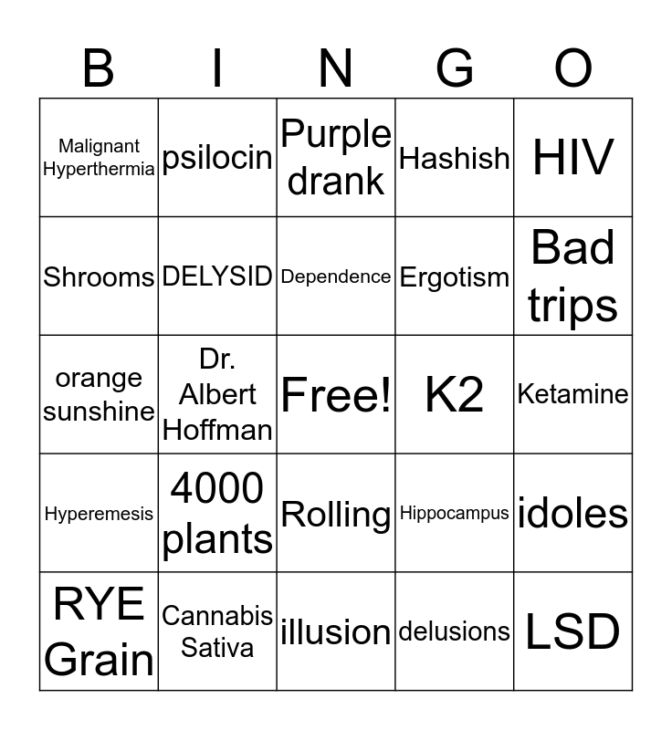 This bingo card has a free space and 45 words: Psychedlics, LSD, PCP, RYE Grain, Synthetic, delusions, Purple drank, nut meg, HIV, Cannabis Sativa, Hashish, K2, Rolling, 4000 plants, Amanita Mushrooms, illusion, hallucination, orange sunshine, MDMA, Bad trips, psilocin, Peyote, MOLLY, Malignant Hyperthermia, Depressant - schedule III, Ketamine, Sinsemilla, Weedy Hemp, Hippocampus, Hyperemesis, Gate way drug, idoles, phenylalkylamines, psychedelics, cannabinoids, Dr. Albert Hoffman, Rituals, Ayahuasca(Yage), Spirals, Dependence, Shrooms, Ergotism, St. Anthony's Fire, DELYSID and Turn on, Turn in, and drop out.