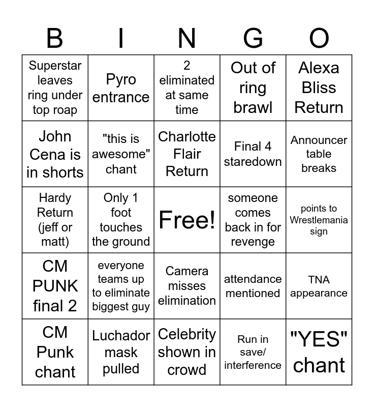 This bingo card has a free space and 29 words: CM Punk chant, AJ Lee Return, Only 1 foot touches the ground, Superstar eliminated in 10 seconds, Superstar leaves ring under top roap, 2 eliminated at same time, "this is awesome" chant, everyone teams up to eliminate biggest guy, someone comes back in for revenge, Luchador mask pulled, points to Wrestlemania sign, "YES" chant, Celebrity shown in crowd, Run in save/ interference, Announcer table breaks, Superstar gets beat up before entering ring, Camera misses elimination, CM PUNK final 2, Alexa Bliss Return, Hardy Return (jeff or matt), attendance mentioned, A Tag Team fights itself, Final 4 staredown, John Cena is in shorts, Out of ring brawl, Pyro entrance, TNA appearance, Charlotte Flair Return and “You suck” chant.