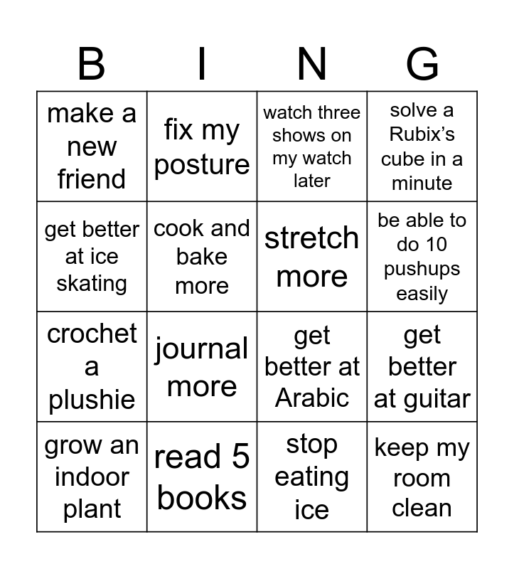 This bingo card has 16 words: read 5 books, get better at guitar, watch three shows on my watch later, make a new friend, crochet a plushie, fix my posture, get better at Arabic, stop eating ice, get better at ice skating, cook and bake more, grow an indoor plant, solve a Rubix’s cube in a minute, journal more, be able to do 10 pushups easily, stretch more and keep my room clean.