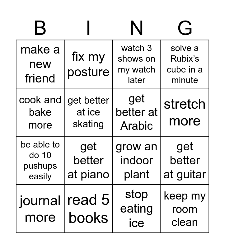 This bingo card has 16 words: read 5 books, get better at guitar, watch 3 shows on my watch later, make a new friend, be able to do 10 pushups easily, fix my posture, grow an indoor plant, stop eating ice, cook and bake more, get better at ice skating, journal more, solve a Rubix’s cube in a minute, get better at piano, stretch more, get better at Arabic and keep my room clean.