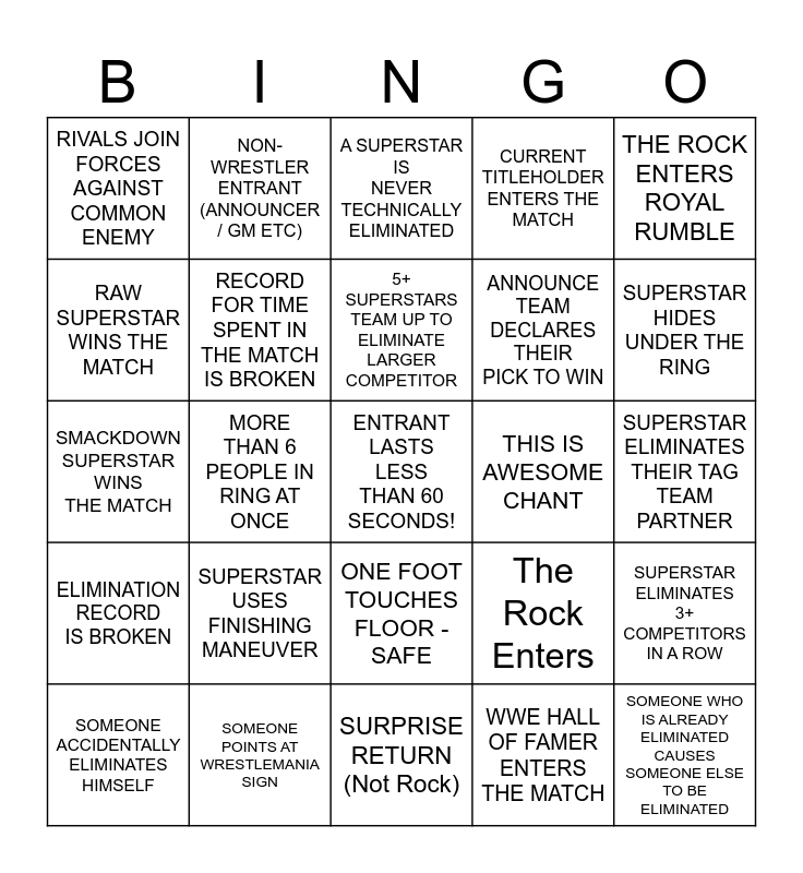 This bingo card has a free space and 27 words: The Rock Enters, SUPERSTAR ELIMINATES THEIR TAG TEAM PARTNER, ANNOUNCE TEAM DECLARES THEIR PICK TO WIN, SURPRISE RETURN (Not Rock), RAW SUPERSTAR WINS THE MATCH, A SUPERSTAR IS NEVER TECHNICALLY ELIMINATED, NON-WRESTLER ENTRANT (ANNOUNCER / GM ETC), ELIMINATION RECORD IS BROKEN, THIS IS AWESOME CHANT, SUPERSTAR ELIMINATES 3+ COMPETITORS IN A ROW, SMACKDOWN SUPERSTAR WINS THE MATCH, CURRENT TITLEHOLDER ENTERS THE MATCH, SOMEONE ACCIDENTALLY ELIMINATES HIMSELF, SOMEONE POINTS AT WRESTLEMANIA SIGN, SUPERSTAR HIDES UNDER THE RING, NXT SUPERSTAR COMPETES IN THE MATCH, RECORD FOR TIME SPENT IN THE MATCH IS BROKEN, 5+ SUPERSTARS TEAM UP TO ELIMINATE LARGER COMPETITOR, SUPERSTAR USES FINISHING MANEUVER, RIVALS JOIN FORCES AGAINST COMMON ENEMY, SUPERSTAR ELIMINATES THEIR TAG TEAM PARTNER, WWE HALL OF FAMER ENTERS THE MATCH, MORE THAN 6 PEOPLE IN RING AT ONCE, SOMEONE WHO IS ALREADY ELIMINATED CAUSES SOMEONE ELSE TO BE ELIMINATED, ONE FOOT TOUCHES FLOOR - SAFE, THE ROCK ENTERS ROYAL RUMBLE and CELEBRITY SHOWN IN CROWD.