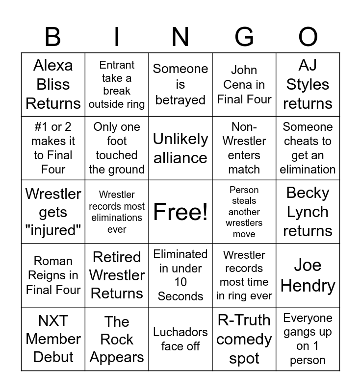 This bingo card has a free space and 24 words: Retired Wrestler Returns, The Rock Appears, Unlikely alliance, NXT Member Debut, AJ Styles returns, Alexa Bliss Returns, #1 or 2 makes it to Final Four, Entrant take a break outside ring, Person steals another wrestlers move, Eliminated in under 10 Seconds, Non-Wrestler enters match, Wrestler gets "injured", Wrestler records most time in ring ever, Joe Hendry, Only one foot touched the ground, R-Truth comedy spot, Becky Lynch returns, Someone is betrayed, Someone cheats to get an elimination, Wrestler records most eliminations ever, Everyone gangs up on 1 person, Roman Reigns in Final Four, John Cena in Final Four and Luchadors face off.