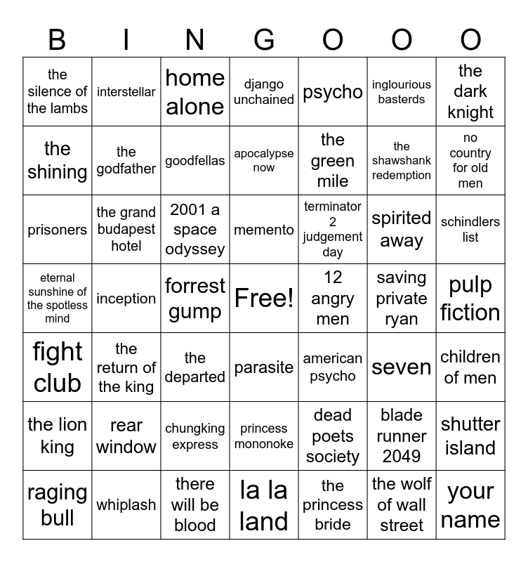 This bingo card has a free space and 48 words: dead poets society, the shawshank redemption, la la land, inception, 2001 a space odyssey, pulp fiction, interstellar, whiplash, inglourious basterds, parasite, the dark knight, django unchained, spirited away, terminator 2 judgement day, the lion king, saving private ryan, the shining, no country for old men, blade runner 2049, psycho, the green mile, forrest gump, the silence of the lambs, the godfather, shutter island, goodfellas, schindlers list, raging bull, memento, the grand budapest hotel, the wolf of wall street, 12 angry men, children of men, rear window, eternal sunshine of the spotless mind, american psycho, seven, prisoners, the departed, chungking express, fight club, your name, home alone, there will be blood, apocalypse now, princess mononoke, the return of the king and the princess bride.