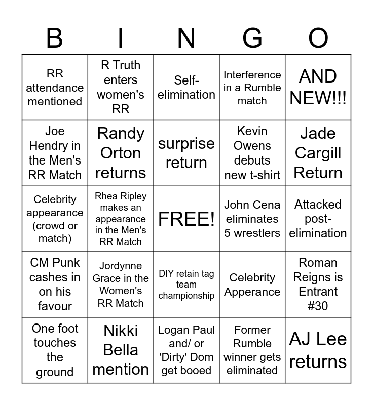 This bingo card has a free space and 48 words: Points at the Mania sign, AJ Lee returns, Cody Rhodes retains in the ladder match, Logan Paul and/ or 'Dirty' Dom get booed, Jordynne Grace in the Women's RR Match, Jade/ Bianca/ Naomi beef begins, R Truth enters women's RR, "This is awesome" chant, Joe Hendry in the Men's RR Match, Nia Jax sits on someone, Randy Orton returns, Interference in a Rumble match, Roman Reigns is Entrant #30, Celebrity Apperance, Commentator in RR, Cody Rhodes heel turn, surprise return, John Cena eliminates 5 wrestlers, AJ Styles returns, AND NEW!!!, Rhea Ripley makes an appearance in the Men's RR Match, Former Rumble winner gets eliminated, RR attendance mentioned, Kevin Owens debuts new t-shirt, Rumble team up to eliminate a superstar, Jade Cargill Return, One foot touches the ground, Charlotte Flair or Iyo Sky wins Women's RR Match, DIY retain tag team championship, CM Punk cashes in on his favour, Paul Heyman betrayal, CM Punk or John Cena win Men's RR Match, Entrant #25 is important, NXT Superstar competes (men or women), Nikki Bella mention, Asuka return, Comedy/ gimmick/ segment, Attacked post- elimination, Big E in ring return, Hall of Famer enters a match, Michael Cole insults 'Dirty' Dom, Announce team declares their pick to win, Self-elimination, Superstar speaks on mic during their entrance, Celebrity appearance (crowd or match), FREE!, Superstar eliminated upon entry and A WWE legend returns.