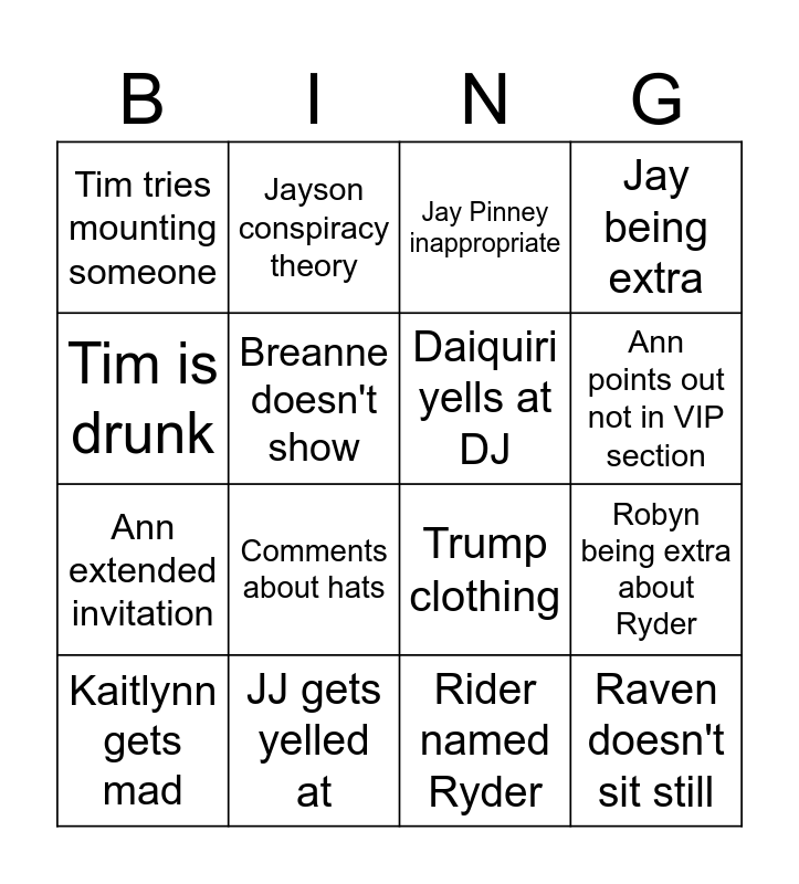 This bingo card has 16 words: JJ gets yelled at, Robyn being extra about Ryder, Jay Pinney inappropriate, Tim tries mounting someone, Ann extended invitation, Jayson conspiracy theory, Trump clothing, Rider named Ryder, Tim is drunk, Breanne doesn't show, Kaitlynn gets mad, Jay being extra, Comments about hats, Ann points out not in VIP section, Daiquiri yells at DJ and Raven doesn't sit still.