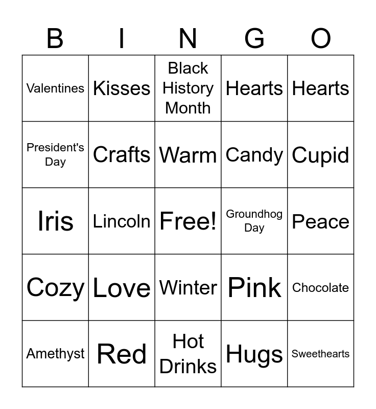 This bingo card has a free space and 24 words: Love, Red, Warm, Amethyst, Hearts, Valentines, President's Day, Kisses, Groundhog Day, Winter, Candy, Iris, Pink, Chocolate, Crafts, Hugs, Peace, Black History Month, Cupid, Lincoln, Sweethearts, Cozy, Hearts and Hot Drinks.