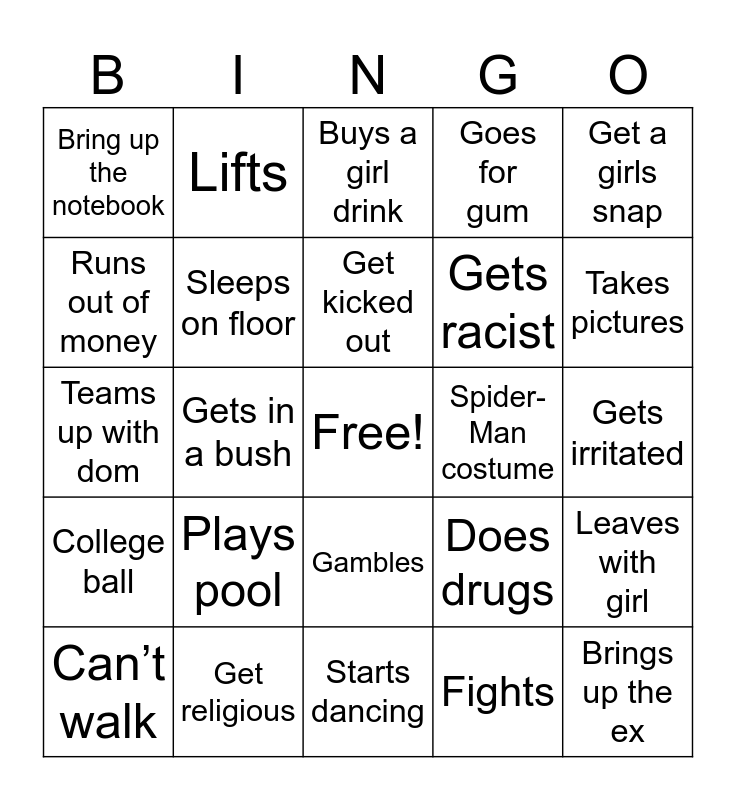 This bingo card has a free space and 24 words: Plays pool, Get religious, Get kicked out, Can’t walk, Get a girls snap, Bring up the notebook, Runs out of money, Lifts, Spider-Man costume, Gambles, Gets racist, Teams up with dom, Does drugs, Leaves with girl, Sleeps on floor, Fights, Gets irritated, Buys a girl drink, Takes pictures, Gets in a bush, Brings up the ex, College ball, Goes for gum and Starts dancing.