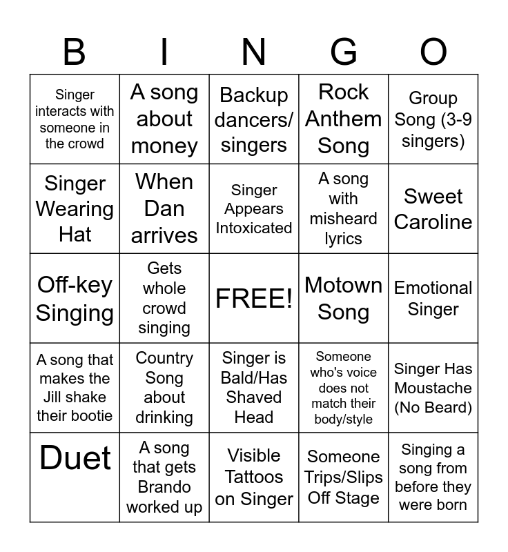 This bingo card has a free space and 24 words: Country Song about drinking, A song that gets Brando worked up, Singer Appears Intoxicated, Duet, Group Song (3-9 singers), Singer interacts with someone in the crowd, Singer Wearing Hat, A song about money, Motown Song, Singer is Bald/Has Shaved Head, A song with misheard lyrics, Off-key Singing, Someone who's voice does not match their body/style, Singer Has Moustache (No Beard), When Dan arrives, Someone Trips/Slips Off Stage, Emotional Singer, Backup dancers/ singers, Sweet Caroline, Gets whole crowd singing, Singing a song from before they were born, A song that makes the Jill shake their bootie, Rock Anthem Song and Visible Tattoos on Singer.